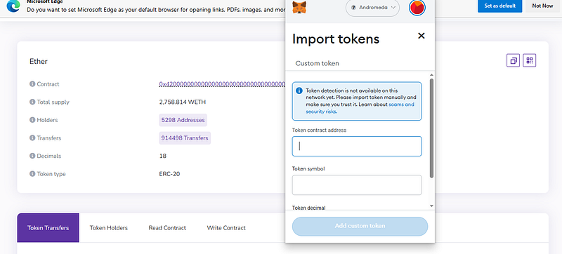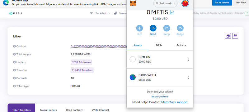To import tokens on Metamask. Open the Metamask wallet, make sure it is set to βMetis Andromedaβ (as pictured above), and import a new token. Add the token's contract address, token symbol, and token decimal. For the example of our ETH transfer, the info will be as follows: