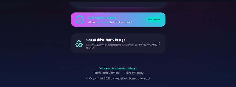 On the home page of the metis.io website, click the βBridgeβ button at the very top of the homepage. This will take you to the Metis Bridge.